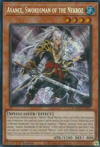 Description: If you Ritual Summon exactly 1 "Nekroz" Ritual Monster with a card effect that requires use of monsters, this card you control can be used as the entire Tribute. When this card is Normal Summoned: You can Special Summon 1 "Nekroz" monster from your Deck, except "Avance, Swordsman of the Nekroz". If this card is Tributed by card effect: You can add any number of your banished "Nekroz" cards with different names to your hand. You can only use this effect of "Avance, Swordsman of the Nekroz" once per Duel.