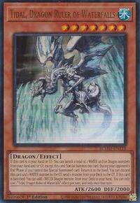Description: If this card is in your hand or GY: You can banish a total of 2 WATER and/or Dragon monsters from your hand and/or GY, except this card; Special Summon this card. During your opponent's End Phase, if this card was Special Summoned: Return it to the hand. You can discard this card and 1 WATER monster to the GY; send 1 monster from your Deck to the GY. If this card is banished: You can add 1 WATER Dragon monster from your Deck to your hand. You can only use 1 "Tidal, Dragon Ruler of Waterfalls" effect per turn, and only once that turn.