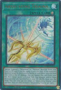 Description: Special Summon 1 "Atlantean" or "Mermail" monster from your hand or GY, and if you do, equip it with this card. If the equipped monster would be destroyed by battle or card effect, you can send this card to the GY instead. You can banish this card from your GY, then target up to 3 of your Fish, Sea Serpent, and/or Aqua monsters that are banished or in your GY; shuffle them into the Deck. You can only use this effect of "Abyss-sting Triaina" once per turn. You can only activate 1 "Abyss-sting Triaina" per turn.