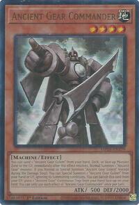 Description: You can send 1 "Ancient Gear Golem" from your hand, Deck, or face-up Monster Zone to the GY; immediately after this effect resolves, Normal Summon 1 "Ancient Gear" monster. If you Normal or Special Summon "Ancient Gear Golem" (except during the Damage Step): You can Special Summon 1 "Ancient Gear Golem" from your hand or GY, ignoring its Summoning conditions. You can banish this card from your GY; place 1 "Ancient Gear" Continuous Trap from your hand face-up on your field. You can only use each effect of "Ancient Gear Commander" once per turn.