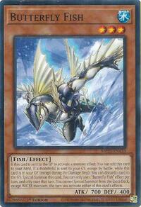 Description: If this card is sent to the GY to activate a monster effect: You can add this card to your hand. If a monster(s) is sent to your GY, except by battle, while this card is in your GY (except during the Damage Step): You can discard 1 card to the GY; Special Summon this card. You can only use 1 "Butterfly Fish" effect per turn, and only once that turn. You cannot Special Summon from the Extra Deck, except WATER monsters, the turn you activate either of this card's effects.