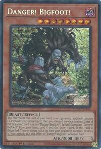 Description: You can reveal this card in your hand; your opponent randomly chooses 1 card from your entire hand, then you discard the chosen card. Then, if the discarded card was not "Danger! Bigfoot!", Special Summon 1 "Danger! Bigfoot!" from your hand, and if you do, draw 1 card. If this card is discarded: You can target 1 face-up card your opponent controls; destroy it. You can only use this effect of "Danger! Bigfoot!" once per turn.