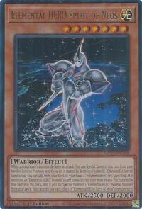 Description: When an opponent's monster declares an attack: You can Special Summon this card from your hand in Defense Position, and if you do, it cannot be destroyed by battle. If this card is Special Summoned: You can add from your Deck to your hand 1 "Polymerization" or 1 Spell/Trap that mentions an "Elemental HERO" monster's card name. During your Main Phase: You can shuffle this card into the Deck, and if you do, Special Summon 1 "Elemental HERO" Normal Monster from your Deck. You can only use each effect of "Elemental HERO Spirit of Neos" once per turn.