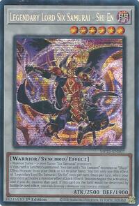 If this card is Synchro Summoned: You can add 1 "Six Samurai" monster or "Shien" Effect Monster from your Deck or GY to your hand. You can only use this effect of "Legendary Lord Six Samurai - Shi En" once per turn. Once per turn, when your opponent activates a monster effect (Quick Effect): You can negate the activation, and if you do, destroy that card. If this card on the field would be destroyed by battle or card effect, you can destroy 1 monster you control instead.