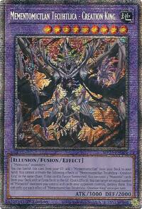 Description: 3 "Memento" monsters You can banish this card from your GY; add 1 "Mementomictlan" from your Deck to your hand. You cannot activate the following effects of "Mementomictlan Tecuhtlica - Creation King" in the same Chain. If this card is Fusion Summoned: You can send 3 "Memento" cards from your Deck and/or Extra Deck to the GY. (Quick Effect): You can target an equal number of "Memento" monsters you control and cards your opponent controls; destroy them. You can only use each effect of "Mementomictlan Tecuhtlica - Creation King" once per turn.
