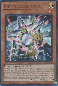 Description: Increase this card's Level by 4 during your opponent's turn only. You can only use each of the following effects of "Metal Illusionist" once per turn. If this card is Normal or Special Summoned: You can Set 1 "Metalmorph" Trap from your Deck, then if "Max Metalmorph" is in your GY, you can draw 1 card. You can declare 1 other Monster Type; this card becomes that Type, until the end of your opponent's turn.