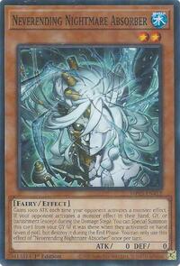 Description: Gains 1000 ATK each time your opponent activates a monster effect. If your opponent activates a monster effect in their hand, GY, or banishment (except during the Damage Step): You can Special Summon this card from your GY (if it was there when they activated) or hand (even if not), but destroy it during the End Phase. You can only use this effect of "Neverending Nightmare Absorber" once per turn.