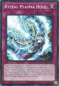 Description: Target face-up cards your opponent controls, up to the number of "Ryzeal" Xyz Monsters you control; destroy them, then you can attach 1 "Ryzeal" card from your GY to 1 Rank 4 Xyz Monster you control. You can banish this card from your GY; immediately after this effect resolves, Xyz Summon 1 Xyz Monster using monsters you control, including a "Ryzeal" monster. You can only use each effect of "Ryzeal Plasma Hole" once per turn.