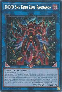 You can target 1 "D/D" or "Dark Contract" card you control; destroy it, also during your Main Phase this turn, you can conduct 1 Pendulum Summon of a "D/D" monster(s) in addition to your Pendulum Summon (you can only gain this effect once per turn). When your opponent activates a monster effect in the hand (Quick Effect): You can banish 1 "D/D" monster and 1 "Dark Contract" card from your GY; negate the activation. You can only use this effect of "D/D/D Sky King Zeus Ragnarok" once per turn.
