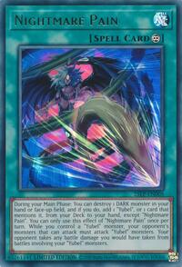 Description: During your Main Phase: You can destroy 1 DARK monster in your hand or face-up field, and if you do, add 1 "Yubel", or 1 card that mentions it, from your Deck to your hand, except "Nightmare Pain". You can only use this effect of "Nightmare Pain" once per turn. While you control a "Yubel" monster, your opponent's monsters that can attack must attack "Yubel" monsters. Your opponent takes any battle damage you would have taken from battles involving your "Yubel" monsters.