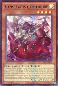 Description: If you control "Fallen of Albaz" or it is in your GY: You can Special Summon this card from your hand. During the Main Phase (Quick Effect): You can Fusion Summon 1 Level 8 or higher Fusion Monster from your Extra Deck, using monsters from your hand or field as material. During the End Phase, if a Fusion Monster(s) was sent to your GY this turn: You can add this card from the GY to your hand. You can only use each effect of "Blazing Cartesia, the Virtuous" once per turn.