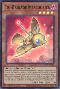 Description: When your opponent activates a monster effect, while you control a Fusion Monster that mentions "Fallen of Albaz" as material (Quick Effect): You can send this card from your hand or face-up field to the GY; negate that effect. If this card is banished: You can add from your Deck to your hand, 1 "Fallen of Albaz", or 1 monster that mentions it, except "Tri-Brigade Mercourier". You can only use each effect of "Tri-Brigade Mercourier" once per turn.