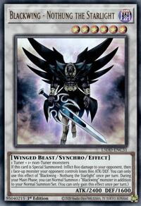 Description: 1 Tuner + 1+ non-Tuner monsters If this card is Special Summoned: Inflict 800 damage to your opponent, then 1 face-up monster your opponent controls loses 800 ATK/DEF. You can only use this effect of "Blackwing - Nothung the Starlight" once per turn. During your Main Phase, you can Normal Summon 1 "Blackwing" monster in addition to your Normal Summon/Set. (You can only gain this effect once per turn.)