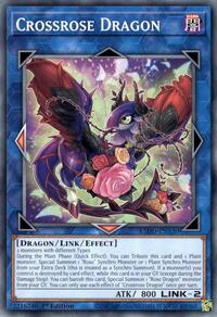 Description: 2 monsters with different Types During the Main Phase (Quick Effect): You can Tribute this card and 1 Plant monster; Special Summon 1 "Rose" Synchro Monster or 1 Plant Synchro Monster from your Extra Deck. (This is treated as a Synchro Summon.) If a monster(s) you control is destroyed by card effect, while this card is in your GY (except during the Damage Step): You can banish this card; Special Summon 1 "Rose Dragon" monster from your GY. You can only use each effect of "Crossrose Dragon" once per turn.