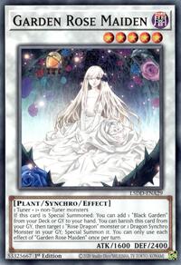 Description: 1 Tuner + 1+ non-Tuner monsters If this card is Special Summoned: You can add 1 "Black Garden" from your Deck or GY to your hand. You can banish this card from your GY, then target 1 "Rose Dragon" monster or 1 Dragon Synchro Monster in your GY; Special Summon it. You can only use each effect of "Garden Rose Maiden" once per turn.
