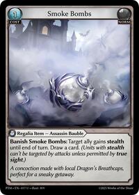Description: Banish Smoke Bombs: Target ally gains stealth until end of turn. Draw a card. (Units with stealth can't be targeted by attacks unless permitted by true sight.)