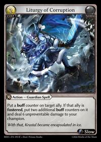 Description: Put a buff counter on target ally. If that ally is fostered, put two additional buff counters on it and deal 6 unpreventable damage to your champion.