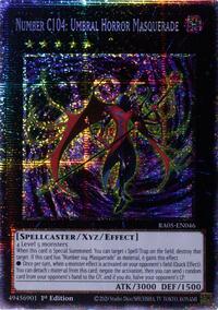 Description: 4 level 5 monsters // When this card is Special Summoned: You can target 1 Spell/Trap Card on the field; destroy that target. If this card has "Number 104: Masquerade" as an Xyz Material, it gains this effect. // * Once per turn, during either player's turn, when a monster effect is activated on your opponent's side of the field: You can detach 1 Xyz Material from this card; negate the activation, then you can send 1 random card from your opponent's hand to the Graveyard, and if you do, halve your opponent's Life Points.