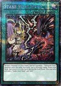 Reveal 1 monster in your hand; Special Summon 1 "Vanquish Soul" monster with the same Attribute, but a different name, from your Deck, but return it to the hand during the End Phase. You can only activate 1 "Stake your Soul!" per turn.