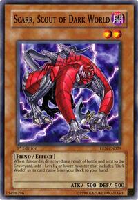 When this card is destroyed as a result of battle and sent to the Graveyard, add 1 Level 4 or lower monster that includes "Dark World" in its card name from your Deck to your hand.