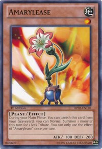 During your Main Phase: You can banish this card from your Graveyard; you can Normal Summon 1 monster this turn for 1 less Tribute. You can only use the effect of "Amarylease" once per turn.