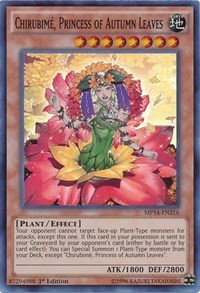 Description: Your opponent cannot target face-up Plant-Type monsters for attacks, except this one. If this card in your possession is sent to your Graveyard by your opponent''s card (either by battle or by card effect): You can Special Summon 1 Plant-Type monster from your Deck, except "Chirubimé, Princess of Autumn Leaves".