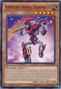 Description: If you have no Spell/Trap Cards in your Graveyard, you can Special Summon this card (from your hand). After this card was Special Summoned this way, you cannot Special Summon monsters for the rest of this turn, except "Superheavy Samurai" monsters. If you have no Spell/Trap Cards in your Graveyard: You can Tribute this card; Special Summon up to 2 monsters from your hand to your opponent's side of the field in Defense Position, then draw 1 card for each monster Special Summoned by this effect. You can only use this effect of "Superheavy Samurai Transporter" once per turn.