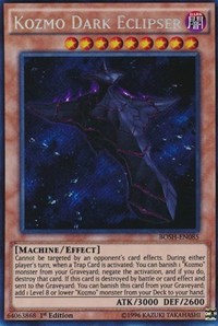 Description: Cannot be targeted by an opponent''s card effects. During either player''s turn, when a Trap Card is activated: You can banish 1 "Kozmo" monster from your Graveyard; negate the activation, and if you do, destroy that card. If this card is destroyed by battle or card effect and sent to the Graveyard: You can banish this card from your Graveyard; add 1 Level 8 or lower "Kozmo" monster from your Deck to your hand.