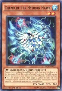 - You can discard 1 card, then target 1 Gemini monster in your Graveyard; Special Summon it in Defense Position. You can only use this effect of "Chemicritter Hydron Hawk" once per turn.