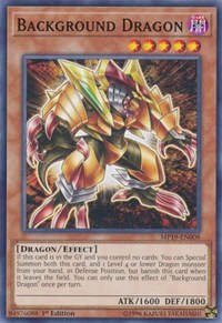 Description: If this card is in the GY and you control no cards: You can Special Summon both this card, and 1 Level 4 or lower Dragon monster from your hand, in Defense Position, but banish this card when it leaves the field. You can only use this effect of "Background Dragon" once per turn.
