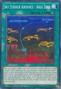 Description: You can target 1 other card you control; excavate the top 3 cards of your Deck, and if you do, you can add 1 excavated "Sky Striker" card to your hand, also shuffle the rest into the Deck, then, if you excavated a "Sky Striker" card, send the targeted card to the GY. If this card in the Field Zone is sent to the GY by a card effect: You can Special Summon 1 "Sky Striker Ace" monster from your Deck. You can only use each effect of "Sky Striker Airspace - Area Zero" once per turn.