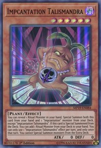 Description: You can reveal 1 Ritual Monster in your hand; Special Summon both this card from your hand and 1 "Impcantation" monster from your Deck, except "Impcantation Talismandra". If this card is Special Summoned from the Deck: You can add 1 Ritual Monster from your Deck to your hand. You can only use 1 "Impcantation Talismandra" effect per turn, and only once that turn. You cannot Special Summon monsters from the Extra Deck.