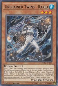 Description: (Quick Effect): You can target 1 card you control; destroy it, also you cannot Special Summon monsters for the rest of this turn, except Fiend monsters. If this card on the field is destroyed by card effect, except "Unchained Twins - Rakea", or by battle: You can Special Summon 1 "Unchained" monster from your hand or Deck, except "Unchained Twins - Rakea". You can only use each effect of "Unchained Twins - Rakea" once per turn.