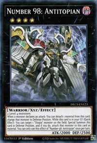 When any player's monster declares an attack: You can detach 1 Xyz Material from this card; change that monster to Defense Position. During either player's turn, while this card is in your Graveyard: You can target 1 "Utopia" monster on the field; Special Summon this card in Defense Position, and if you do, attach that monster to this card as an Xyz Material. You can only use this effect of "Number 98: Antitopian" once per turn.