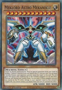 Description: Cannot be Normal Summoned/Set. Must be Special Summoned (from your hand) by sending 3 "Meklord" monsters from your hand to the Graveyard, and cannot be Special Summoned by other ways. Once per turn: You can target 1 Synchro Monster your opponent controls; equip that target to this card. This card gains ATK equal to the combined ATK of the monsters equipped to it by this effect. Once per turn, during your Standby Phase: You can send 1 of these equipped monsters you control to the Graveyard; inflict damage to your opponent equal to that monster's original ATK. You cannot conduct your Battle Phase the turn you activate this effect.