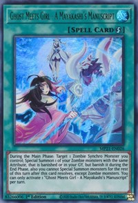 Description: During the Main Phase: Target 1 Zombie Synchro Monster you control; Special Summon 1 of your Zombie monsters with the same Attribute, that is banished or in your GY, but banish it during the End Phase, also you cannot Special Summon monsters for the rest of this turn after this card resolves, except Zombie monsters. You can only activate 1 "Ghost Meets Girl - A Mayakashi's Manuscript" per turn.