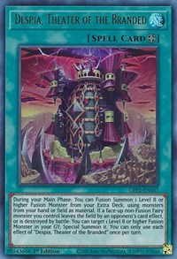 Description: During your Main Phase: You can Fusion Summon 1 Level 8 or higher Fusion Monster from your Extra Deck, using monsters from your hand or field as Fusion Material. If a face-up non-Fusion Fairy monster you control leaves the field by an opponent's card effect, or is destroyed by battle: You can target 1 Level 8 or higher Fusion Monster in your GY; Special Summon it. You can only use each effect of "Despia, Theater of the Branded" once per turn.