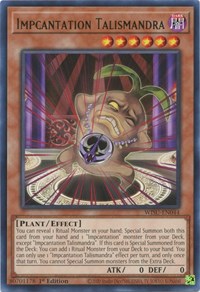 Description: You can reveal 1 Ritual Monster in your hand; Special Summon both this card from your hand and 1 "Impcantation" monster from your Deck, except "Impcantation Talismandra". If this card is Special Summoned from the Deck: You can add 1 Ritual Monster from your Deck to your hand. You can only use 1 "Impcantation Talismandra" effect per turn, and only once that turn. You cannot Special Summon monsters from the Extra Deck.