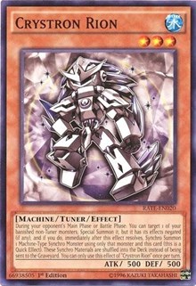 Description: During your opponent''s Main Phase or Battle Phase: You can target 1 of your banished non-Tuner monsters; Special Summon it, but it has its effects negated (if any), and if you do, immediately after this effect resolves, Synchro Summon 1 Machine-Type Synchro Monster using only that monster and this card (this is a Quick Effect). These Synchro Materials are shuffled into the Deck instead of being sent to the Graveyard. You can only use this effect of "Crystron Rion" once per turn.