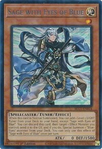 Description: When this card is Normal Summoned: You can add 1 Level 1 LIGHT Tuner from your Deck to your hand, except "Sage with Eyes of Blue". You can discard this card, then target 1 Effect Monster you control; send it to the GY, and if you do, Special Summon 1 "Blue-Eyes" monster from your Deck. You can only use this effect of "Sage with Eyes of Blue" once per turn.