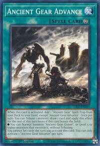 Description: When this card is activated: Add 1 "Ancient Gear" Spell/Trap from your Deck to your hand, except "Ancient Gear Advance". Once per turn: You can Tribute 1 monster; draw 1 card and apply this effect for the rest of this turn (even if this card leaves the field). • You can Normal Summon "Ancient Gear Golem", or Level 5 or higher monsters that mention it, without Tributing. You cannot Set cards the turn you activate this card. You can only activate 1 "Ancient Gear Advance" per turn.