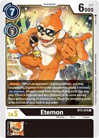 [On Deletion] Reveal 5 cards from the top of your deck. You may play 1 level 6 Digimon card with [Etemon] in its name among them without paying its memory cost. Place the remaining cards at the bottom of your deck in any order.