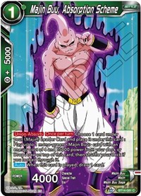 Description: [Union-Absorb] [Once per turn] Choose 1 card under your "Majin" Leader Card and place it under this card: Play up to 1 mono-green "Majin Buu" card with an energy cost of 4 and 15000 power from your deck or Drop Area on top of this card, then shuffle your deck if you looked-through it.