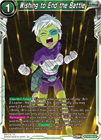 Description: [Counter:Attack] If your Leader is a green "Broly : Br" Z-Leader : Negate the attack. Additionally, you may place 2 Extras from under one of your green "Broly : Br" cards in their owner's Drops. If you do, your opponent can only attack 2 more times for the turn.