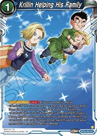 Description: [Activate:Main] [Limit 1] If your Leader is a blue "Android 18" card : Draw 1 card, look at up to 7 cards from the top of your deck, place up to 1 "Krillin" or "Android 18" card—both blue—among them in your Drop, shuffle your deck, and if you placed a "Krillin" or "Android 18" card in your Drop, switch up to 1 of your mono-blue energy to Active Mode.