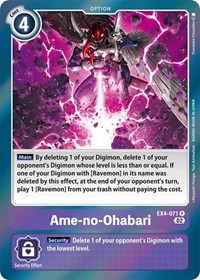 Description: [Main] By deleting 1 of your Digimon, delete 1 of your opponent's Digimon whose level is less than or equal. If one of your Digimon with [Ravemon] in its name was deleted by this effect, at the end of your opponent's turn, play 1 [Ravemon] from your trash without paying the cost.