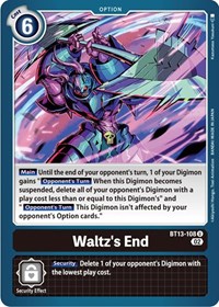 Description: [Main] Until the end of your opponent's turn, 1 of your Digimon gains "[Opponent's Turn] When this Digimon becomes suspended, delete all of your opponent's Digimon with a play cost less than or equal to this Digimon's" and "[Opponent's Turn] This Digimon isn't affected by your opponent's Option cards."