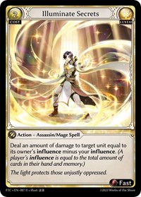 Description: Deal an amount of damage to target unit equal to its owner's influence minus your influence. (A player's influence is equal to the total amount of cards in their hand and memory.)