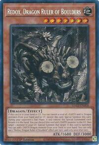 Description: If this card is in your hand or GY: You can banish a total of 2 EARTH and/or Dragon monsters from your hand and/or GY, except this card; Special Summon this card. During your opponent's End Phase, if you control this Special Summoned card: Return it to the hand. You can discard this card and 1 EARTH monster to the GY, then target 1 monster in your GY; Special Summon that target. If this card is banished: You can add 1 EARTH Dragon monster from your Deck to your hand. You can only use 1 "Redox, Dragon Ruler of Boulders" effect per turn, and only once that turn.