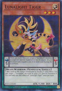 If this card on the field is destroyed by battle or card effect: You can target 1 "Lunalight" monster in your Graveyard; Special Summon it. You can only use this effect of "Lunalight Tiger" once per turn.
